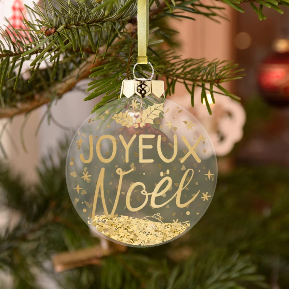Cette boule de Noël transparente « Joyeux Noël » comprend des confettis dorés en forme d’étoiles.