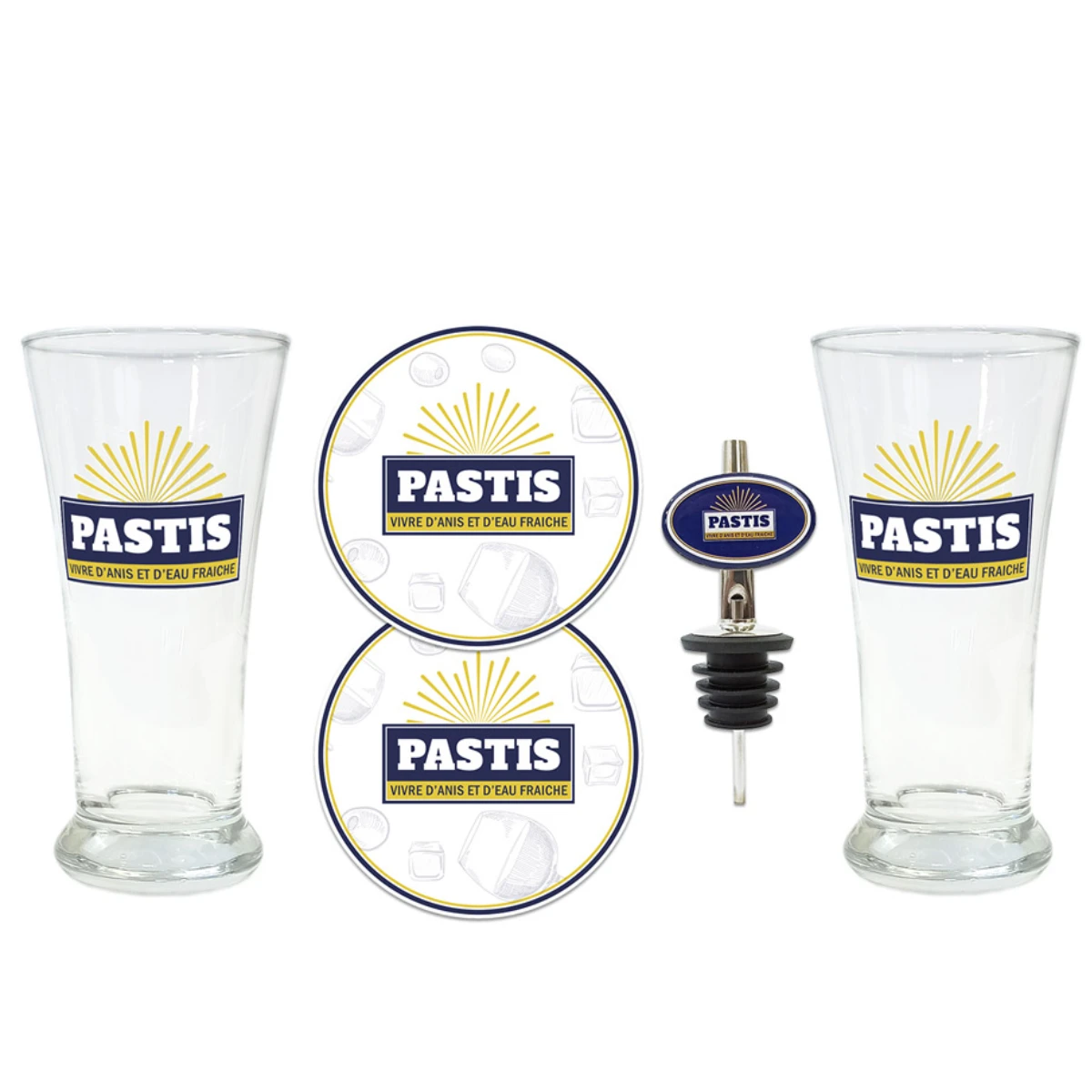 Le coffret comprend 2 verres, 2 dessous de verre et un bec verseur.