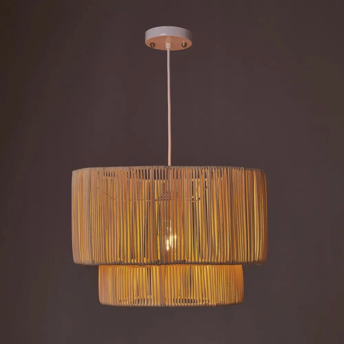 Conçu avec une combinaison harmonieuse de rotin et de mĂ©tal, ce lustre reprĂ©sente un mariage rĂ©ussi entre des matĂ©riaux naturels et une structure mĂ©tallique solide. La longueur de câble de 90 cm offre une flexibilitĂ© dans son installation, s’adaptant ainsi Ă diverses hauteurs de plafond.