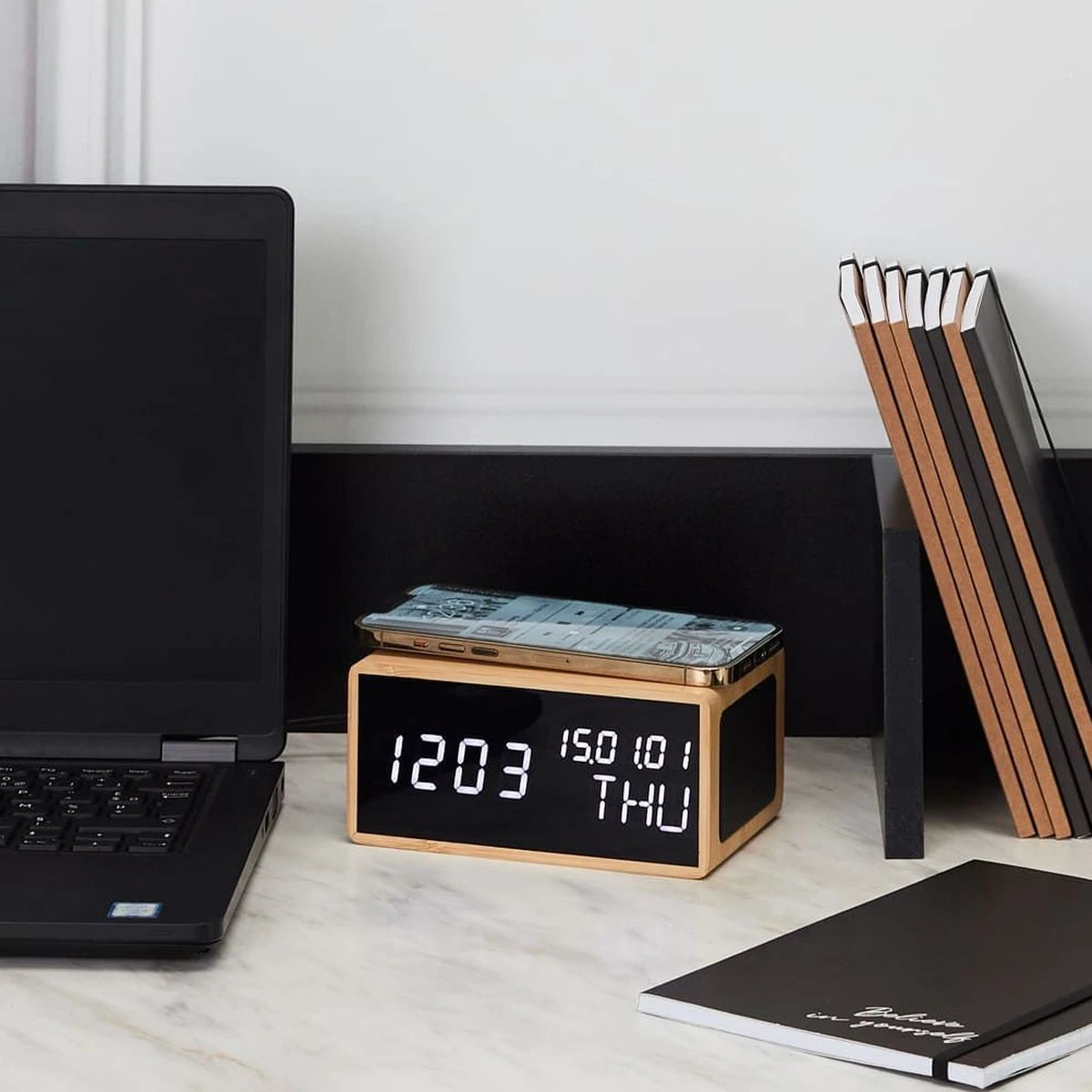 Réveil enceinte en bambou avec chargeur de téléphone par induction