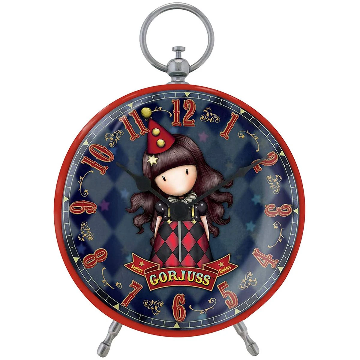 Le rĂ©veil Gorjuss Circus a un boĂ®tier en mĂ©tal colorĂ© et une façade en verre, les pieds et l’anneau supĂ©rieur sont en mĂ©tal chromĂ© argentĂ©.