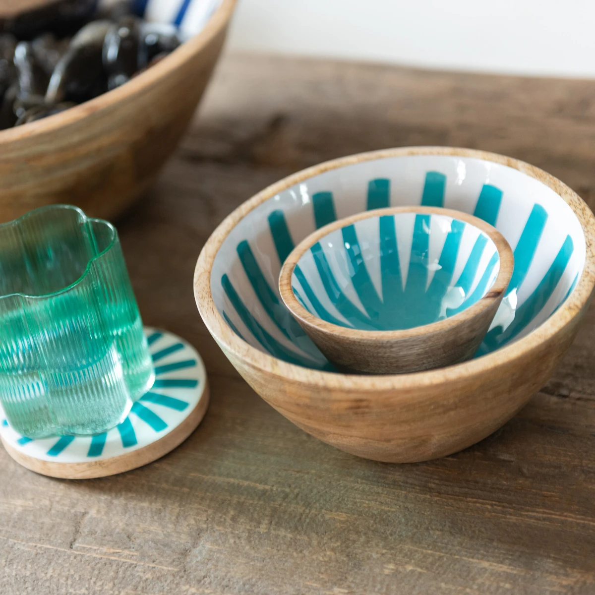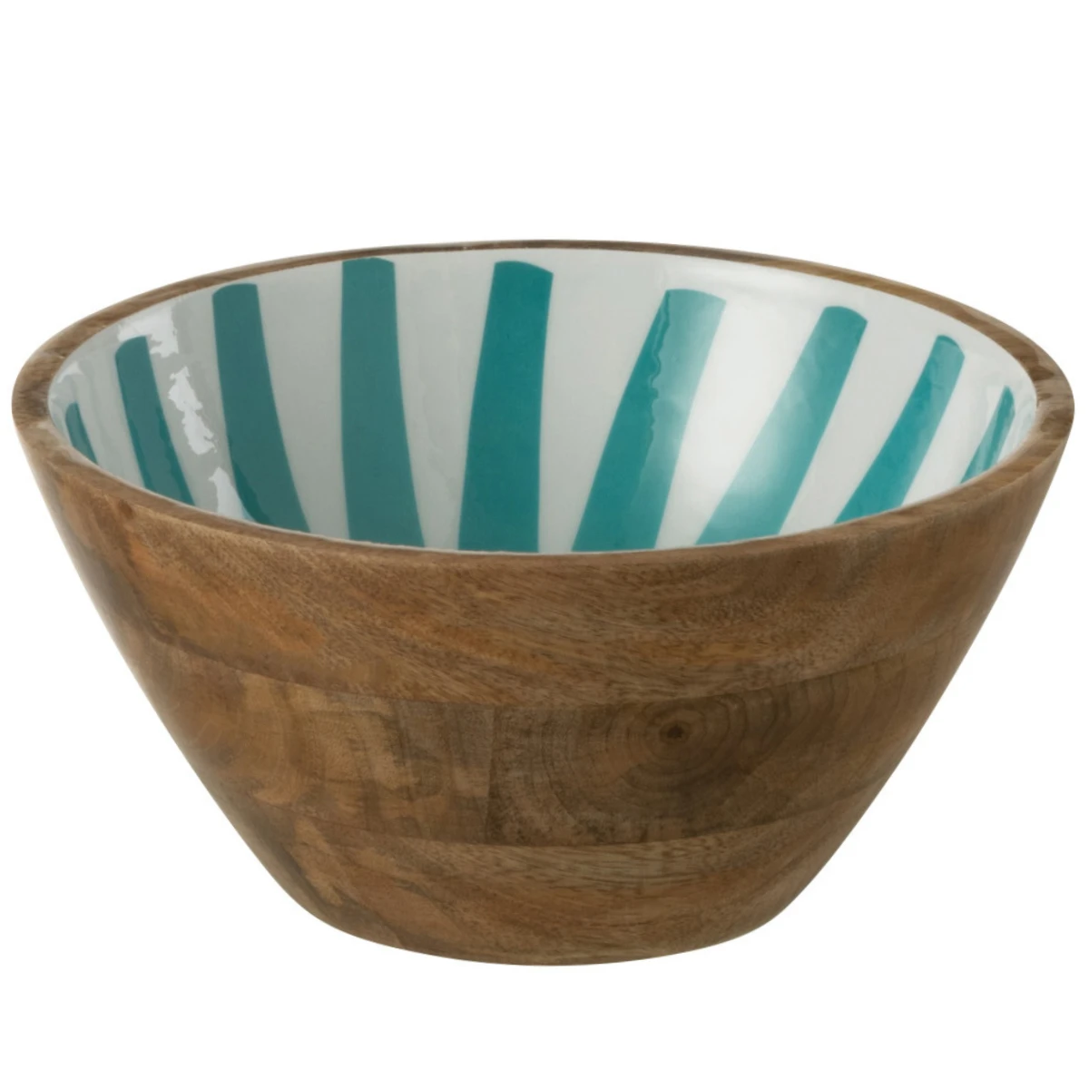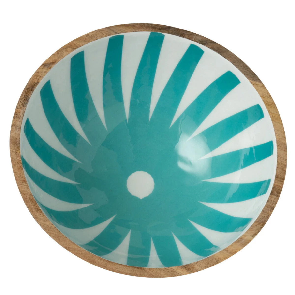 Saladier en manguier décoré 24 cm – turquoise et blanc