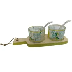Ce set comprend une planche en bois , 2 verrines et de 2 cuillères en céramique