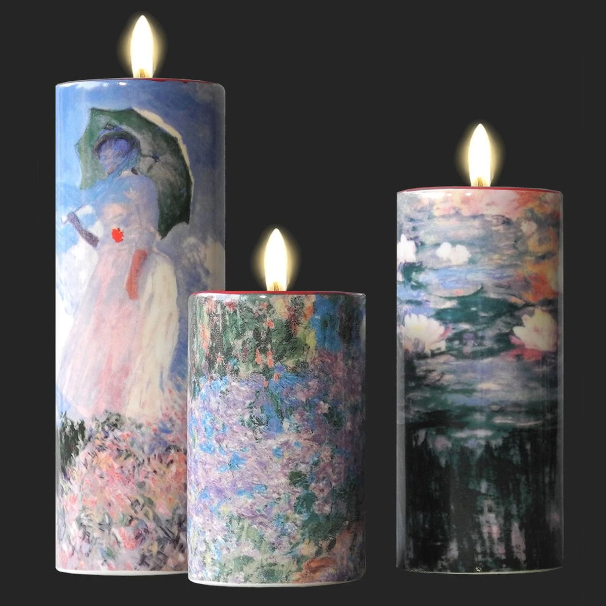 3 portes bougies reprĂ©sentants 3 oeuvres de MONET soit Femme Ă l’ombrelle tournĂ©e vers la gauche – Le Jardin de l’artiste Ă Giverny – Les nymphĂ©as
