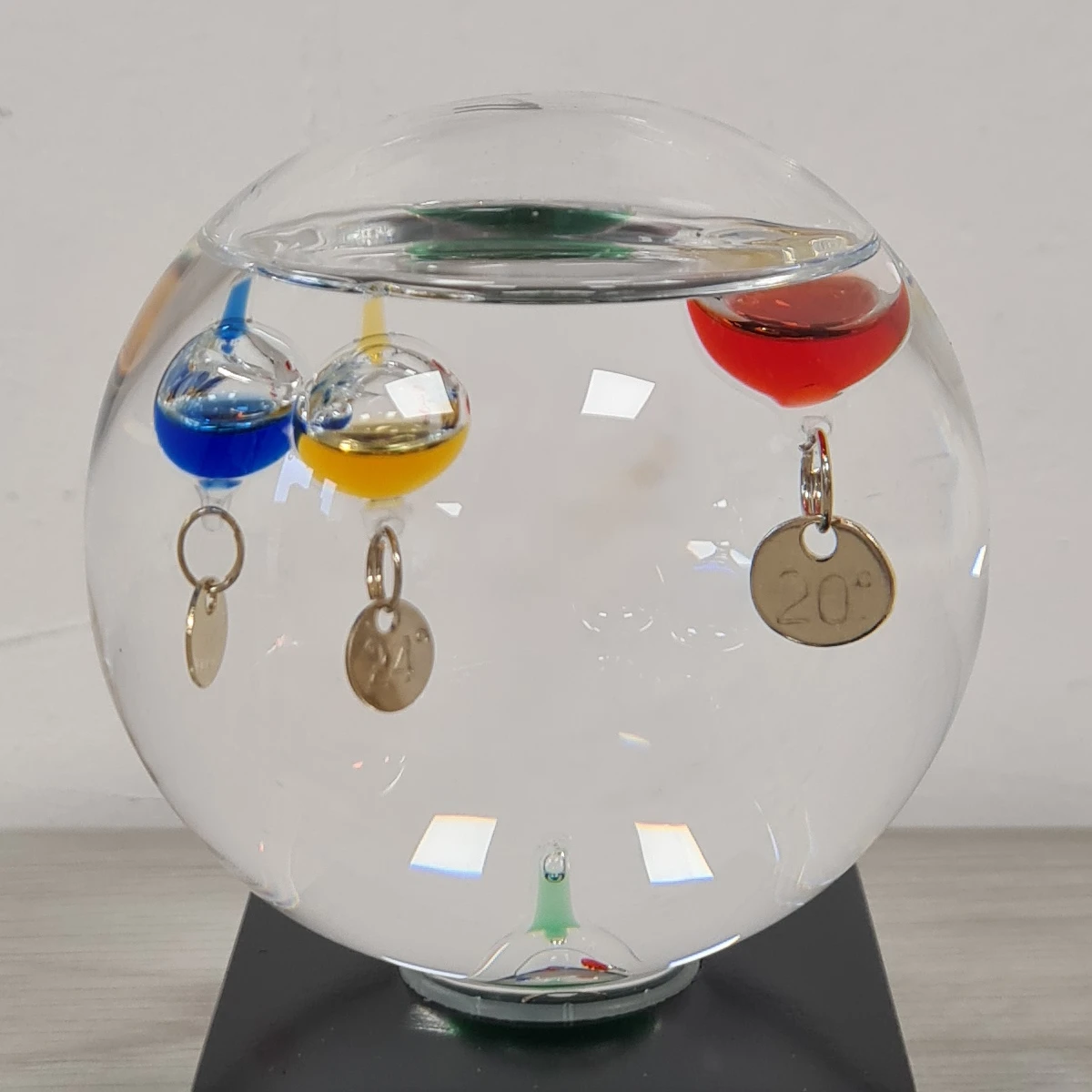 Le thermomètre dit de Galilée est un thermomètre basé sur le principe que lorsque la température diminue, les liquides contenus dans les ampoules se dilatent modifiant par là même leur densité. Vous pouvez ainsi déterminez la température qu’il fait en relevant la valeur indiquée sur la médaille de l’ampoule flottant le plus haut dans le cylindre.