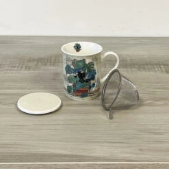 Cette tisanière comprend le mug, un couvercle et un infuseur en métal.
