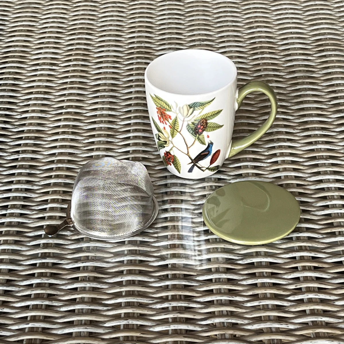 Cette tisanière comprend le mug, un couvercle et un infuseur en métal.